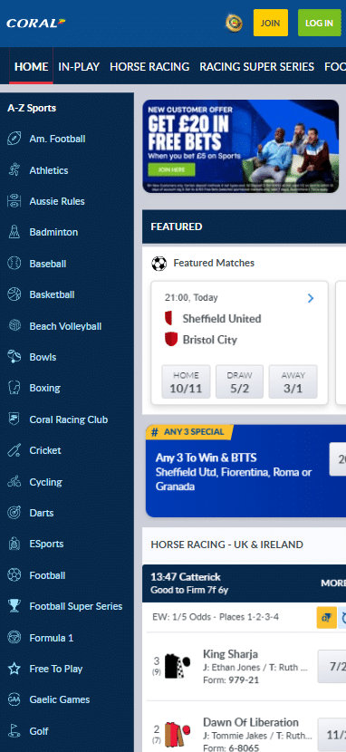The website is very well laid out, highly organised, and designed with user-friendliness in mind. It features the familiar Coral colour scheme of blue and white. All of the key sections of the site have their tabs at the top, complemented by a sub-slider below. An A-Z list of available sports for betting is displayed on the left side of the page.