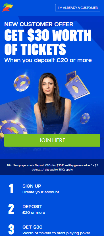 New players can claim £30 in SPINS tickets when they deposit £20 or more. The £30 is credited as 6 x £5 SPINS tickets, which can be used to start playing poker.