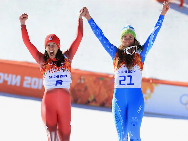 The gold medal was split for the first time in an alpine skiing event at the Winter Olympics, with Tina Maze of Slovenia and Dominique Gisin of Switzerland both managing a time of 1:41.57.